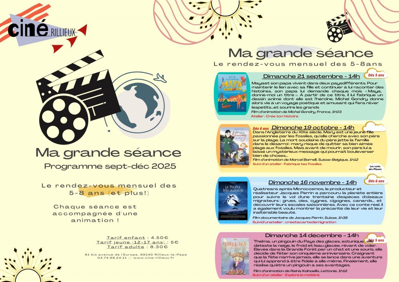 Ma Grande Séance est la continuité de ma petite séance pour les enfants en capacité de comprendre et appréhender des films plus long et plus compliqué. Cette programmation, construite en parcours s'adresse aux enfants à partir de 6 ans. Nous donnons rendez-vous tout les troisième dimanche du mois à 14h.